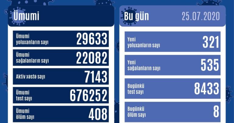 Azerbaycan`da son 24 saatte 321 kişide daha yeni tip koronavirüs tespit edildi, 535 kişi ise iyileşti.