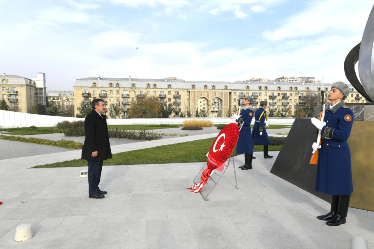 Cumhurbaşkanı Yardımcısı Yılmaz, önce 2. Karabağ Savaşı’nda kazanılan zaferin anısına inşa edilen Zafer Anıtı’nı ziyaret ederek çelenk bıraktı.