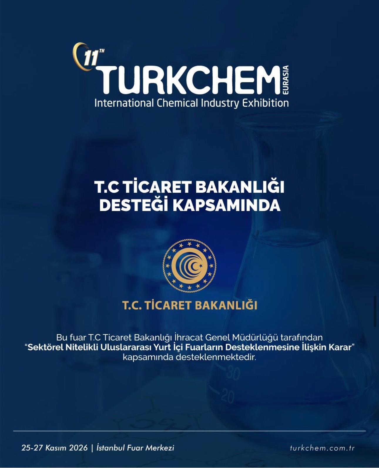 25–27 Kasım 2026 tarihleri arasında İstanbul Fuar Merkezi’nde düzenlenecek olan 11. Uluslararası Kimya Sanayi Fuarı TURKCHEM Eurasia, T.C. Ticaret Bakanlığı’nın “Sektörel Nitelikli Uluslararası Yurt İçi Fuarların Desteklenmesine İlişkin Karar” kapsamında desteklenen fuarlar arasında yer almaktadır.